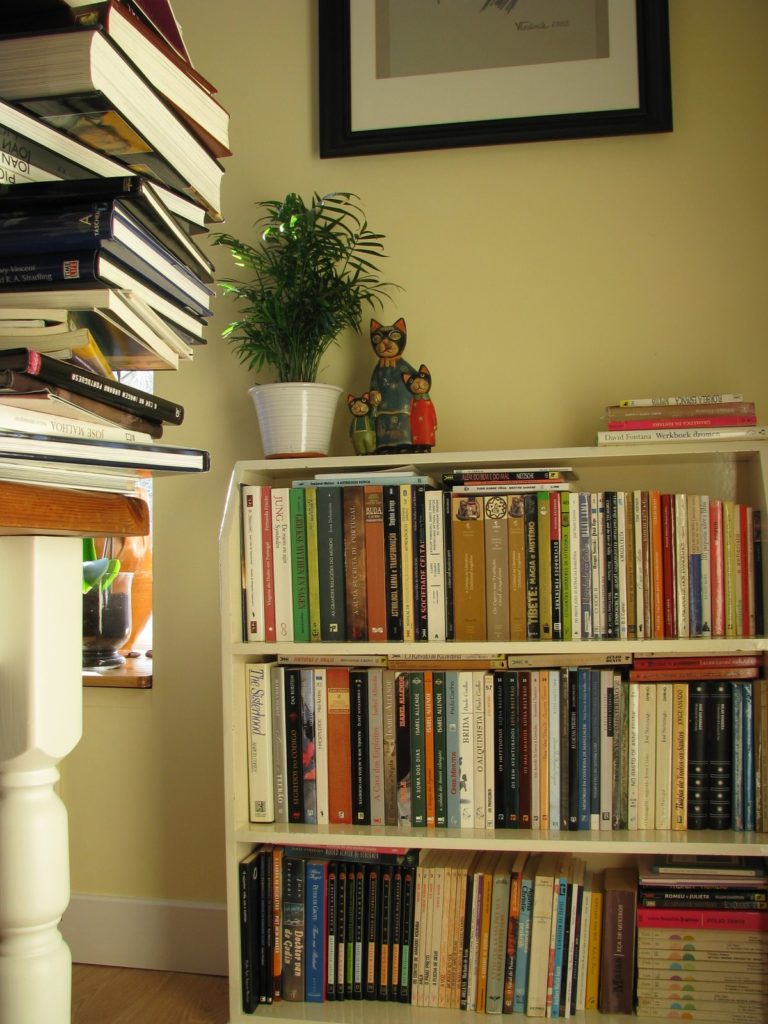 Encontrei a estante que há muito procurava. Não muito alta, para manter a ideia de amplitude de que tanto gosto, mas com espaço para muitos livros (talvez um décimo do que há cá por casa). A cor também corresponde, tem até umas pequenas flores pintadas de lado e o seu ar velho e usado dá alma à sala. É por isso que adoro a ideia de aproveitar coisas em segunda mão e o recomendo vivamente. Para além de ser barato, é ecológico, e não deixa de ser um teste à nossa fonte criativa. A verdade é que a sala ficou tal e qual como gostaria que ficasse e sempre que lá passo sinto vontade de sorrir.